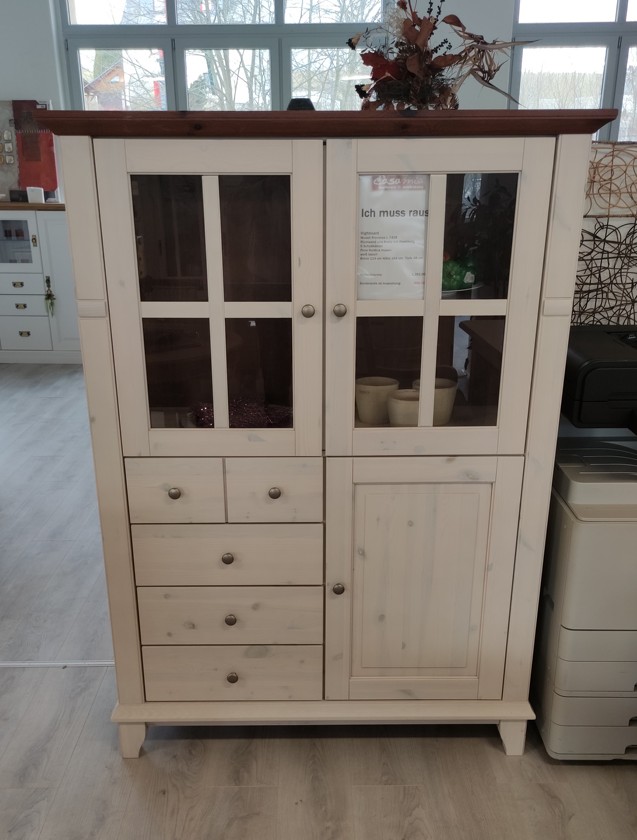 - Massivholz Highboard Ausstellungsstück aus traditionell verarbeiteter Pinie Nordica im Landhaus-Stil mit brauner Absetzung