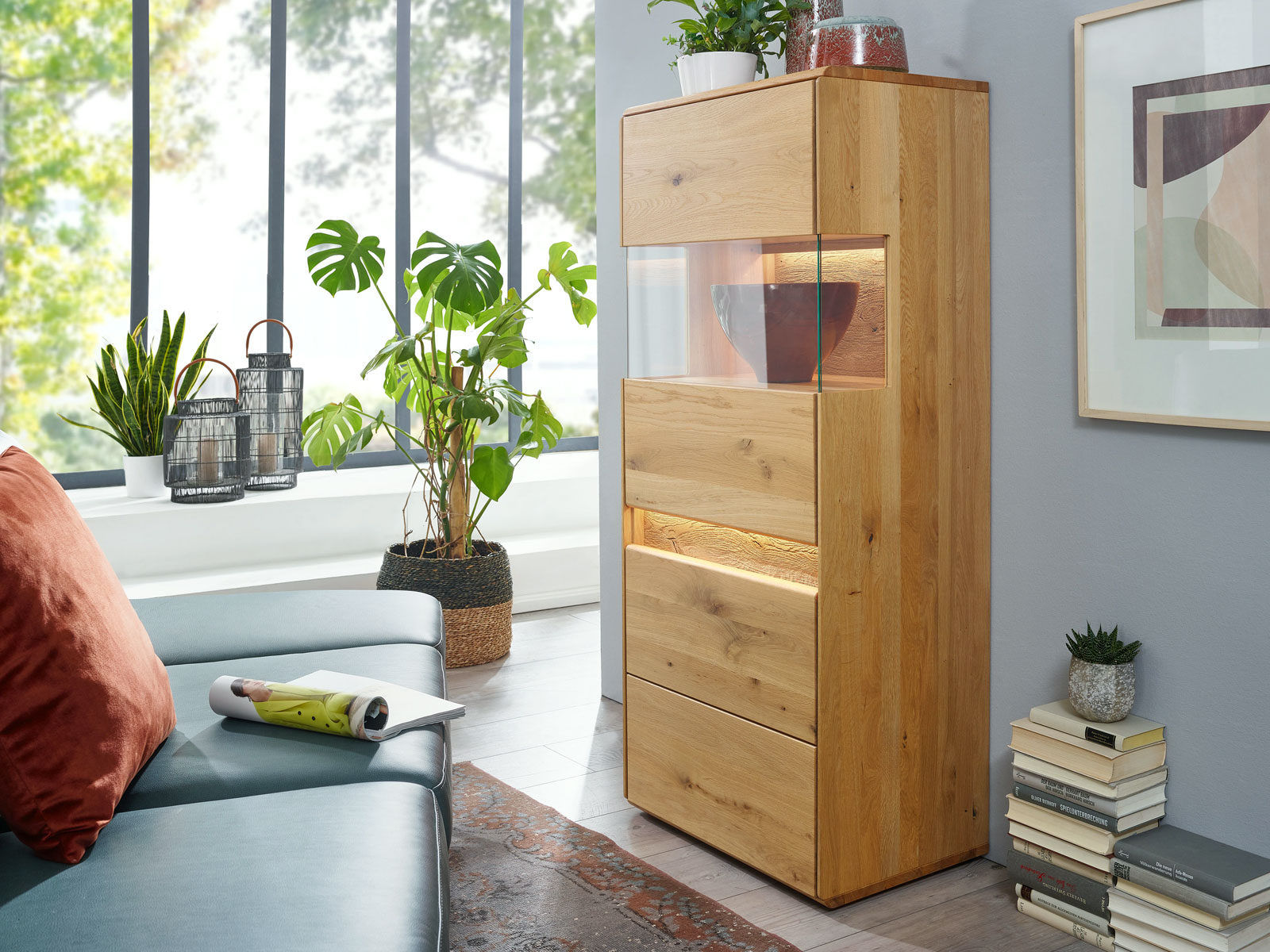 - Highboard mit toller Holzstruktur natürlich verarbeitet und Highlight beleuchteter Querschnitt aus Wildeiche