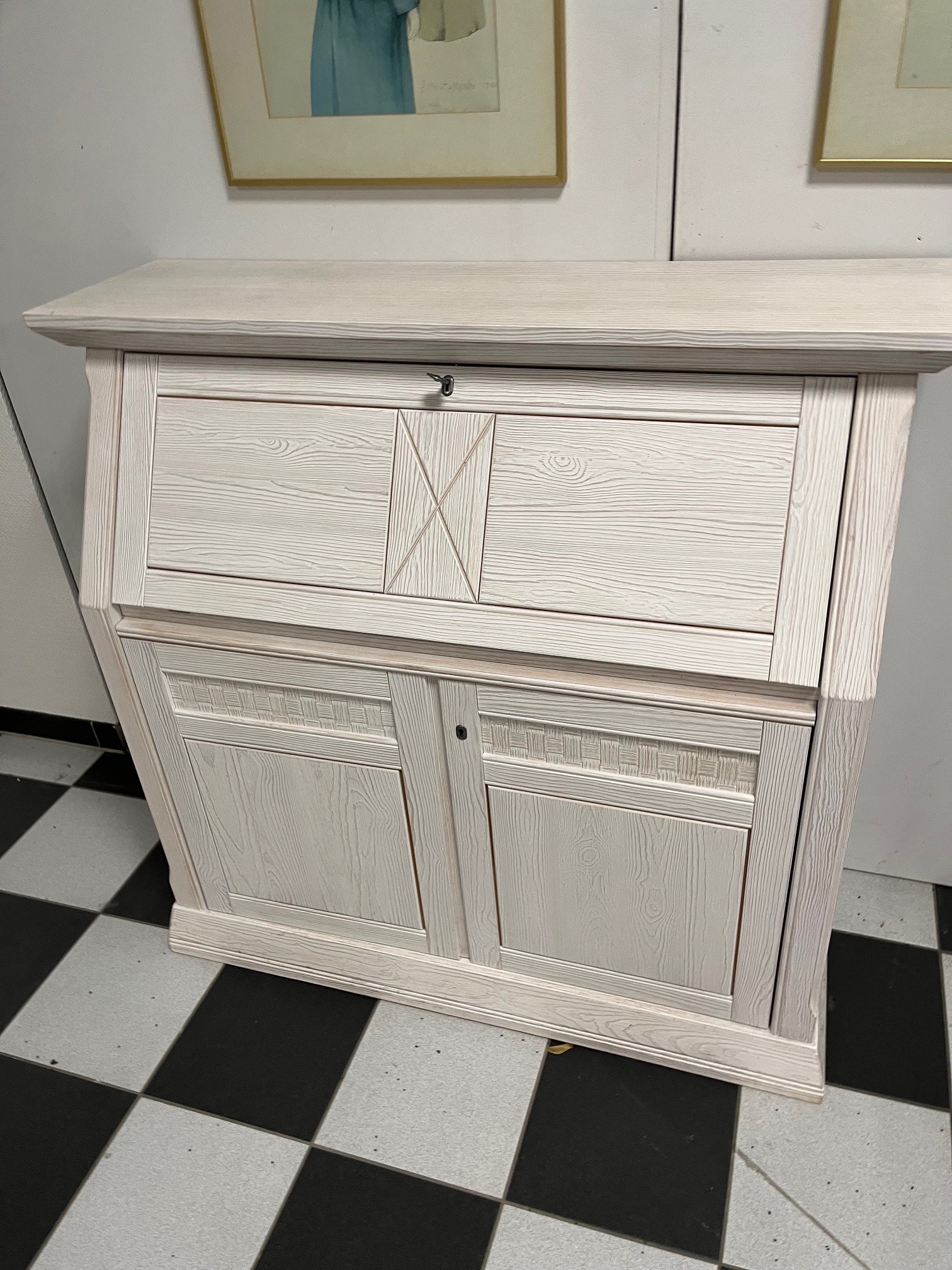 - Massivholz-Sekretär aus traditionell verarbeiteter Pinie im Landhaus-Stil, Schlüssel und Beschläge altsilberfarbig
