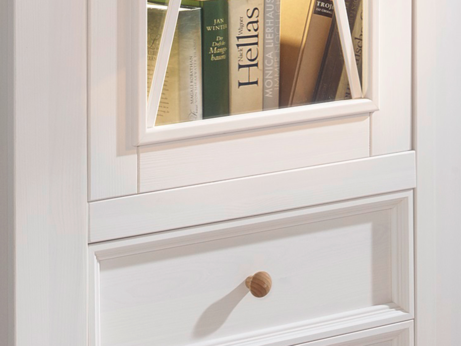 - Massivholz-Vitrine aus traditionell verarbeiteter Pinie Nordica mit eichefarbenen Holz-Griffen